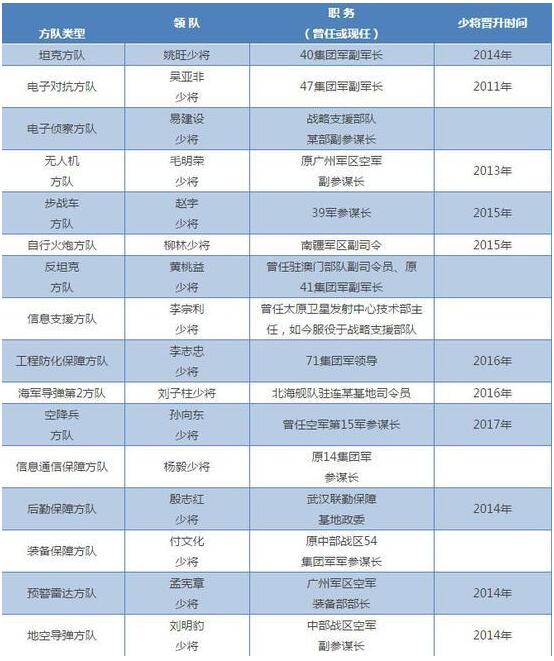 兩年前那場閱兵的領隊將軍,來自于全軍各大單位。此次受閱的28名少將來自各個軍事單位,曾在陸軍集團軍任職的很多:比如曾任40集團軍副軍長的坦克方隊領隊姚旺少將、曾任39軍參謀長的步兵車方隊領隊趙宇少將、曾任14集團軍參謀長的信息通信保障方隊領隊楊毅少將等等。