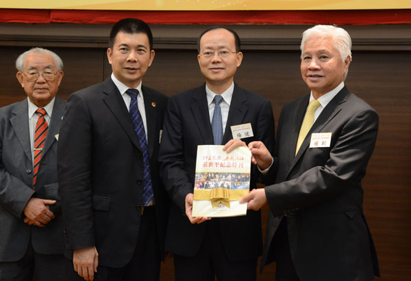 楊釗(右)、譚錦球致送莊世平紀念特刊予楊健(中)。