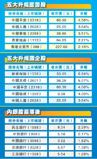 中資金融股跟隨大市造好,具北水支持的工商銀行(1398)昨日收報5.54元,升1.28%。中國銀行(3988)昨日漲1.82%,收報3.92元。而六家上市險企相繼發布了上半年保費數據,因而帶動股價向好,其中新華保險(1336)升幅最高,收報53.95元,大升6.94%。
