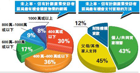 調查又顯示,28%未持有物業的受訪者計劃置業,當中有九成人認為目前上車困難,其中有45%受訪者考慮靠父母或其他家人協助支付首期,只有43%受訪者打算會使用個人或共同買家積蓄。美聯住宅部行政總裁布少明認為,以上數據反映買樓「靠父幹」已成首置人士的主流,而且現時年輕一代有趨向靠家人協助付首期實現置業夢象。