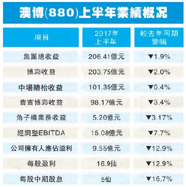 另外,澳博(880)亦於同日公布上半年業績。由於澳門賭業競爭加劇,澳博收益收窄,上半年集團博彩收益、經調整EBITDA及公司擁有人應占溢利分別較上年同期下跌2.0%、7.7%及12.9%;中期股息較去年同期跌1仙,每股派5仙。