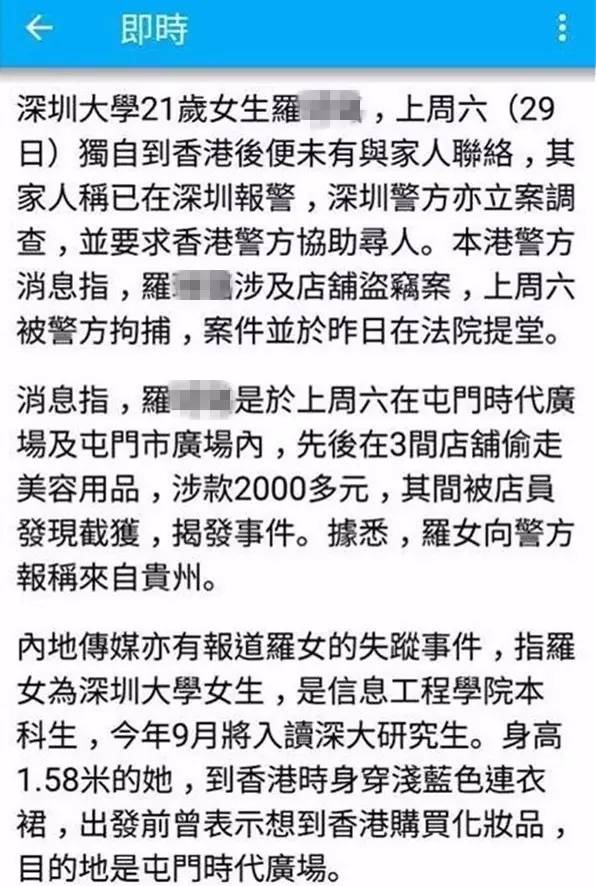 深圳大學失聯女生涉盜竊被捕 輔導員:誰都會犯錯,但不排除被誤會