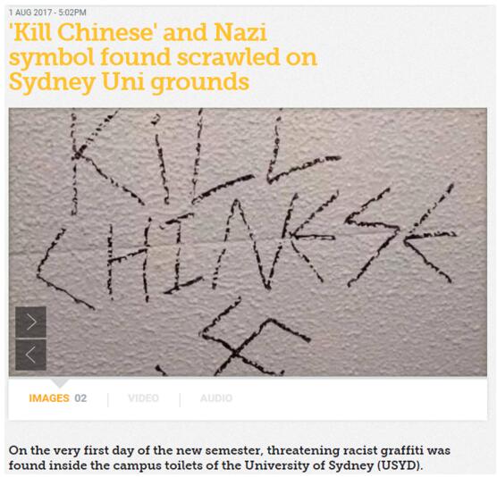 【環球時報駐澳大利亞特約記者 高崧】澳大利亞墨爾本大學、蒙納士大學辱華海報事件尚未平息,悉尼大學又驚現“殺死中國人”留言。據澳大利亞SBS電視臺8月1日報道,7月31日是悉尼大學開學第一天,有人向該校學生會反映,在留學生休息室男廁所墻上發現“KILL CHINESE”(殺死中國人)的字樣,文字下方還畫有象征納粹的標志。