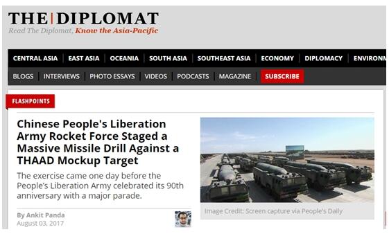 3日,美國《外交學者》也報道了“中國人民解放軍火箭軍大規模軍演模擬攻擊薩德”的消息。