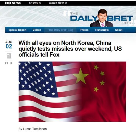 【環球網報道記者王一劉洋】“當全世界都盯著朝鮮的時候,中國上周末悄悄進行了導彈試射”,8月2日,美國福克斯新聞網(FOX NEWS)宣稱從美國匿名官員處得到了這一大消息,并稱,中國此舉是在向美國和全世界“發出信號”。