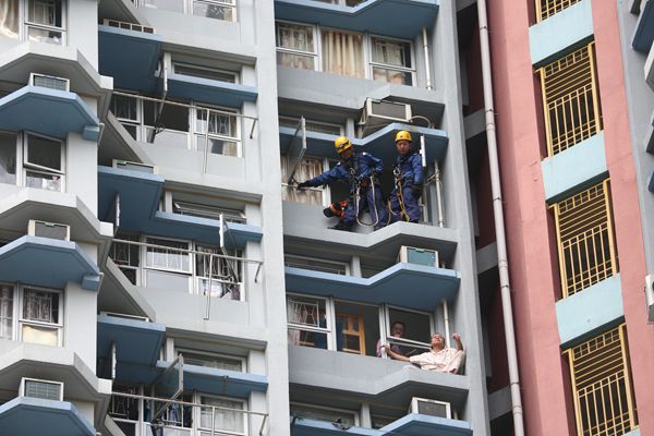 消防員在樓上游繩戒備,談判專家則在旁游說危坐窗邊男子。