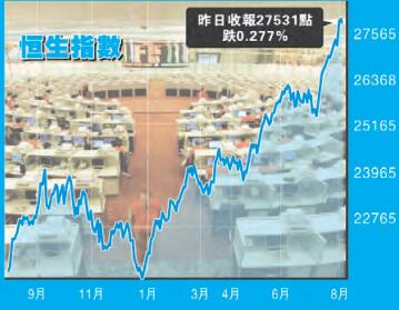 恒指連升7個月,7月最后一個交易日創下近28個月新高27324點。踏入8月恒指繼續上揚,再創高位27747點,直迫28000點;與2015年4月因滬港通消息刺激創下的28588點高位,相差只有841點。8月首2個交易日成交均超過1000億元,6日平均成交達915億元。
