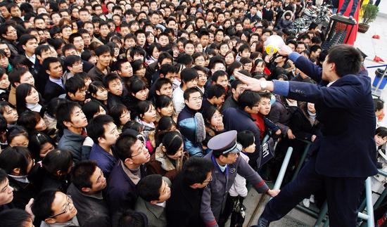 圖為在招聘會外排隊的求職者。