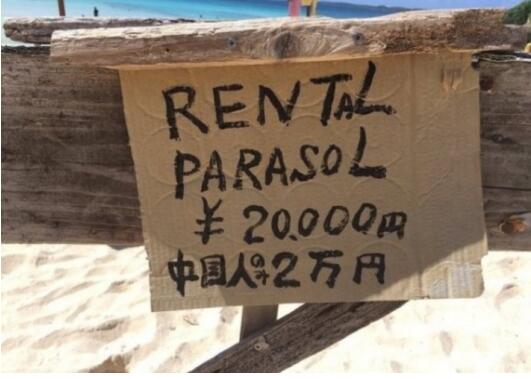 當地海灘的太陽傘租金一般為2000日元(約合人民幣121元),但最近有人發現,某商家故意對中國游客開價10倍。