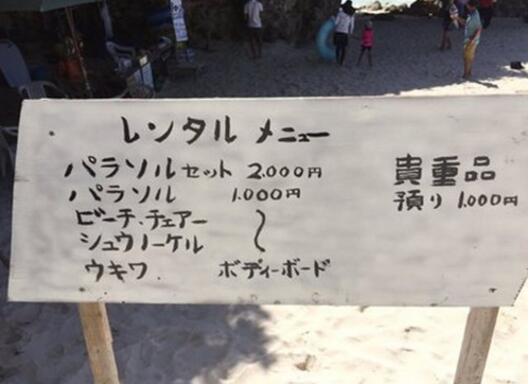 一般的廣告牌寫著:太陽傘套餐組合2000日元,單租太陽傘、沙灘椅之類的1000日元,保管貴重物品1000日元