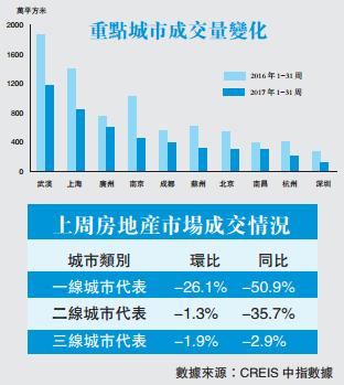 CREIS中指數據顯示,上周(2017年7月31日-2017年8月6日)重點監測的26個城市成交面積環比下降6.7%。其中13個城市環比下降,占監測城市的50%;與去年同期相比,27個代表城市成交量整體下降32.8%,其中17個城市均有所下降。