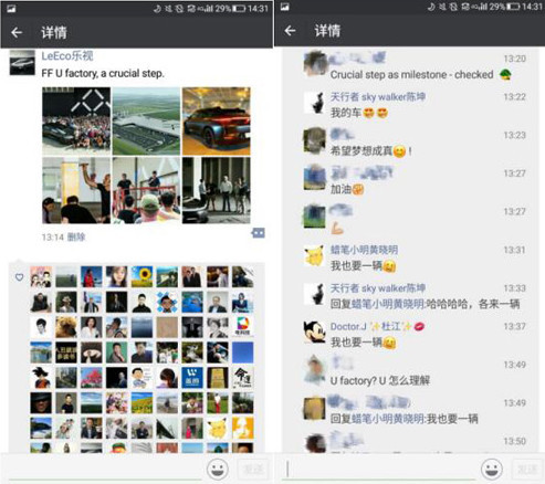 證券日報記者注意到,樂視汽車生態董事長賈躍亭於8月7日在朋友圈發布了新工廠揭幕的多張照片,並寫下“FF U factory,a crucial step。”該條朋友圈隨即獲得了大量點贊和評論,其中不乏一些明星大咖,比如陳坤就評論說“我的車!”,黃曉明和杜江等也紛紛回複:“我也要一輛”,還有眾多人為賈躍亭造車的這一重要進展表示了支持和鼓勵。