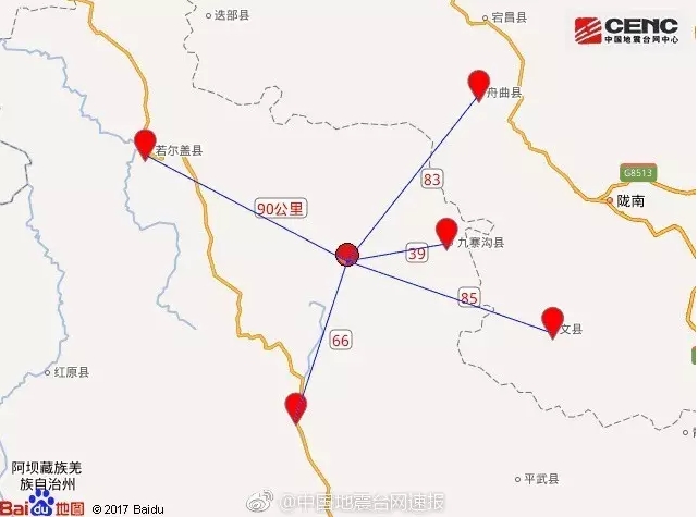 震中距九寨沟县39公里、距松潘县66公里、距舟曲县83公里、距文县85公里、距若尔盖县90公里,距陇南市105公里,距成都市285公里。本次地震周边5公里内的村庄有比芒,20公里内的乡镇有漳扎镇。