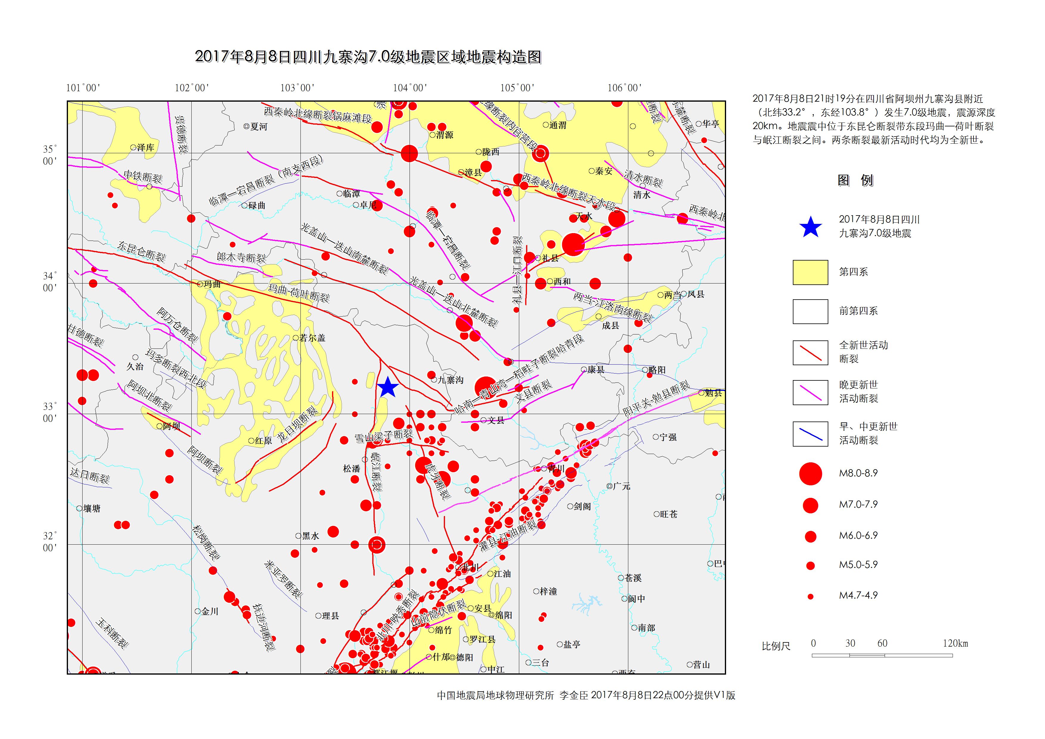 据中国地震台网正式测定,8月8日21时19分,在四川阿坝州九寨沟县发生7.0级地震,震源深度20千米,震中位于北纬33.20度,东经103.82度。震源深度20.0公里。