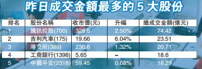 汽車股方面,吉利(175)銷售數字佳,股價破位見20.05元,全日大升6%,收報19.66元,為表現最佳藍籌。通達集團(698)發盈警,預計截至6月30日止6個月純利將按年減少20%至30%,主因是應收帳減值,以及研發開支增加。該股昨挫逾一成報2.05元。