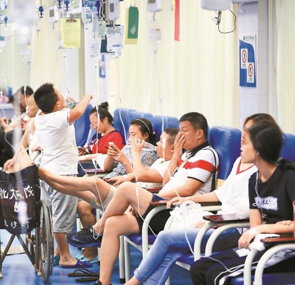8月7日,北大深圳醫院輸液區擠滿了就診的市民。深圳晚報圖