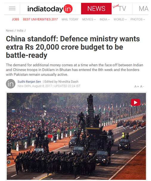 海外網8月9日電 中印在洞朗地區的對峙仍在持續,8日,印度媒體又發起“挑釁”。《今日印度》網站發文稱,在中印對峙之際,印度國防部擬額外增加2千億盧比的軍費預算,該報道還在標題中揣測稱,此舉是為了做好戰爭準備。