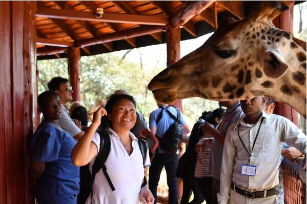 資料圖:在肯尼亞首都內羅畢的長頸鹿中心,一名中國游客和長頸鹿互動。 新華社記者孫瑞博攝