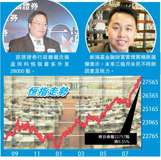 溫杰認為,未來3個月大市應該都不會有太多不明朗的因素及阻力,到第4季要留意德國的選舉、英國脫歐等,美國是否真會啟動縮表等,暫時來看本月都未見有太大挑戰,因為升得多有回調的話,回調的幅度都有限,惟9月份市場的波動或會較大,不排除高位於本月出現,港股第4季能否再創新高難定,暫時看高位或於本月出現,預計恒指有力上試28000點。