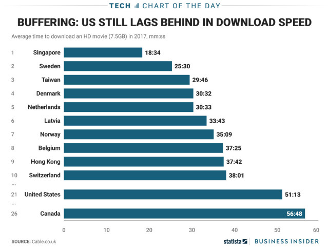 瑞典、中國台灣、丹麥、荷蘭和拉脫維亞等地的平均寬帶下載網速均超過30Mbps。與之相比,有139個國家和地區的平均寬帶下載網速不到10Mbps。
