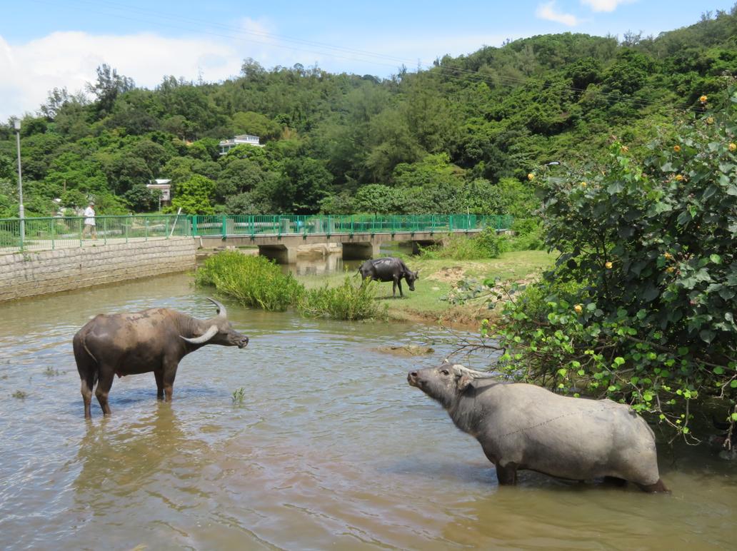 離開拾塱舊村,過天后廟、貝澳灣,到鹹田舊村,即見生滿茂樹的河流,到達時,7、8隻在河裏濕身的水牛已上了青草地,正走往樹林裏抖暑。續沿芝麻灣道到貝澳泳灘(風貌見N12版),士多老闆告知車道兩邊有草地,那裏也有些水牛。帶點興奮心情,走落右邊草地,才發覺有很多小水,沒有裝備下,很難接近遠方的牛群,而距離水牛不遠處有一大片土地已填上約一呎高的泥頭,中間有一部小型推土機。回走看左邊草地,發現泥頭堆積更高,估計比成年男子更高,有如一座小山。