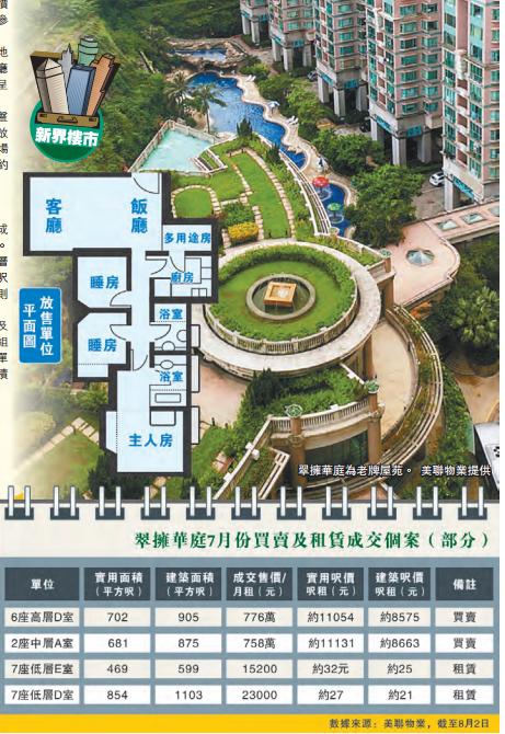 資料又顯示,該行6月於「翠擁華庭」有7宗買賣成交,平均成交呎價約11013元,按月高出90元或0.8%。至於7月成交個案方面,主要集中3房戶,當中6座高層D室上月以776萬元易手,實用面積702平方呎,實用呎價約11054元。2座中層A室,實用面積681平方呎,則以758萬元沽出,實用呎價約11131元。
