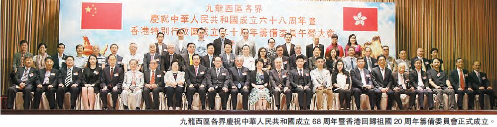 【香港商報网訊】記者文曉琳、李嘉倩報道﹕九龍西區各界慶祝中華人民共和國成立68周年暨香港回歸祖國20周年籌備委員午餐大會,日前假尖沙咀龍堡國際賓館隆重舉行。會上通過了籌委會成員名單,陳亨利膺主任委員。籌委會定於9月25日在尖沙咀文化中心音樂廳舉行「慶祝國慶暨香港回歸文藝晚會」,9月27日在尖沙咀龍堡國際賓館舉行「慶祝國慶暨香港回歸聯歡晚會」,與市民一起歡度國慶。