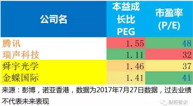 那么在选择科技股的时候要考虑什么呢?如果要考虑一家公司的成长性的话,本益成长比(PEG)就是一个很好的指标,这个指标除了考虑每股盈利,即一家公司目前的盈利能力,还考虑了一家公司的成长能力。该指标越小则说明一家公司在相对估值方面也值得买入,也就是这家公司在考虑了其盈利能力和成长性后显得“很划算”。从上表可以看出,虽然腾讯的股价很高,市盈率也比舜宇光学要高不少,但两者的本益成长比(PEG)却相差不远。说明投资者认为腾讯有较大的成长潜力,而在考虑了成长性以后腾讯的估值并不算高。更明显的例子就是金蝶国际的市盈率比舜宇光学高,但本益成长比(PEG)却比较小,说明投资者认为金蝶国际更具有成长性,相对更有买入价值。