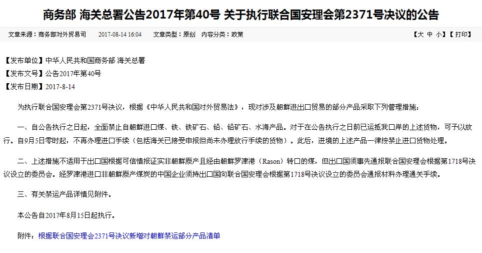 商务部 海关总署公告2017年第40号 关于执行联合国安理会第2371号决议的公告