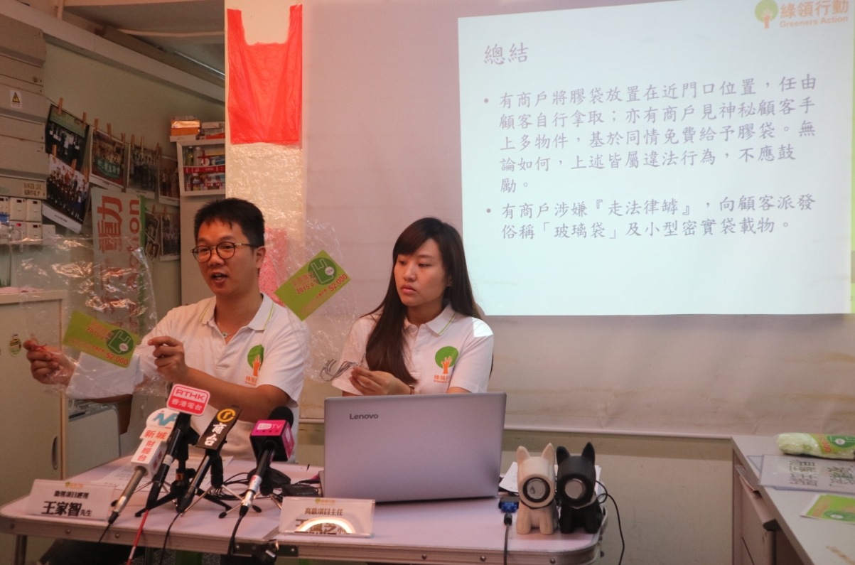 有調查在今年7至8月進行,共到旺角、深水埗、灣仔、中環等逾百間非連鎖店商戶「放蛇」,購買非豁免收費物品。調查結果顯示,有35%商戶免費向顧客派發膠袋,比2016年同類型調查下跌兩成。「綠領行動」助理項目經理王家智表示,近九成商戶不主動派發膠袋,比去年的42%大幅增加,但仍有7%從事服裝、五金、精品、雜貨買賣的商戶「偷鸡」,主動派發膠袋予顧客而沒有收費。