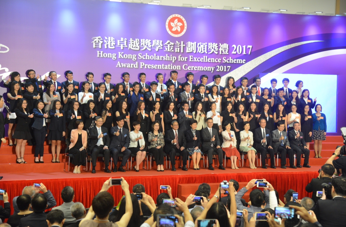 旨在資助本地學生赴境外升讀知名大學的「香港卓越獎學金計劃頒獎禮2017」,昨日在政府總部舉行,由行政長官林鄭月娥主持;教育局局長楊潤雄、香港卓越獎學金計劃督導委員會主席馮國經均有出席。