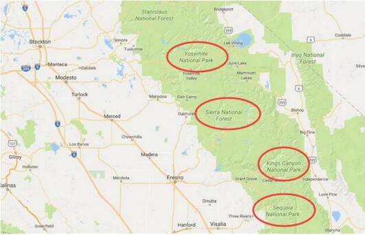 國王峽谷國家公園緊鄰紅杉國家公園,和優勝美地國家公園隔了一個塞拉利昂國家森林公園。截圖來自谷歌
