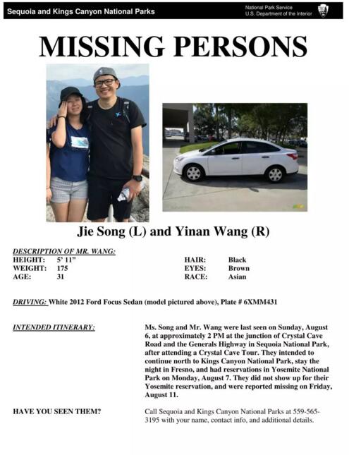 美國國家公園管理局官網8月12日發布尋人啟事稱,正在加州紅杉國家公園(Sequoia National Park)內自駕旅游的中國夫婦王一楠(音,Yinan Wang)、宋婕(音,Jie Song)自8月6日下午2時左右失聯后,至今下落不明,時間已超過一周。
