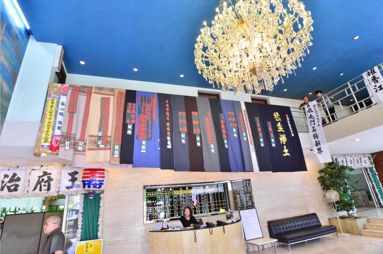 發叔靈堂素白,鮮花簇擁,橫匾寫上「德高望重」。記者馮俊文攝