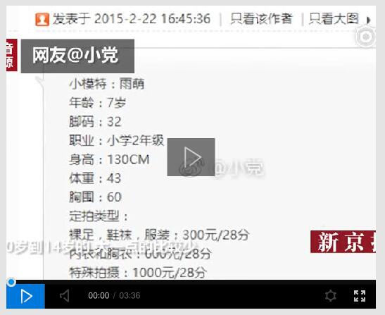 “小党”在微博中表示,自己花费30元注册了该网站成为会员,网站为一个恋童癖恋足癖的地下网站,主要通过卖视频等方式盈利,现已衍生出名为“童模”、“正太”等分支网站。