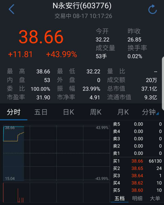 騰訊科技訊 8月17日消息,共享單車第一股永安行今日正式上市,開盤即一字漲停,漲幅43.99%,報收38.66元。