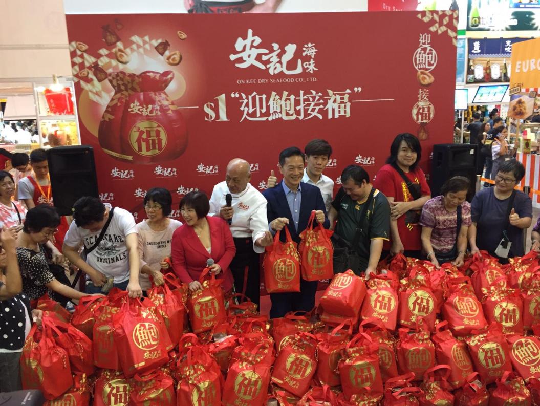 今年安記海味推出「迎鮑接福」游戲,共有10人成功參與游戲,起初2隊各獲得4個福袋,后尾安記的董事總經理潘權輝聯同兒子一同參與,共接得16個福袋,嘉賓李家鼎指「18」較好意頭,故決定每位參賽者可獲18個福袋。輝哥說,原本以為4至7月的零售市道較差,今年銷情與去年相若,但經過動漫節帶動氣氛,加上開幕排隊人數,以及市民的購物爆發力,估計營業額會有5%至10%增長。