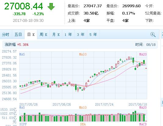 美國政局不穩形勢升溫,加上西班牙發生恐襲,隔夜美股三大指數全線下挫,道指創3個月最大跌幅。今早亞太股市大跌,恒生指數今早低開1.26%,報26999.6點;國企指數低開0.95%,報10699.31點;紅籌指數低開0.73%,報4224.15點。大市成交額19.1億。