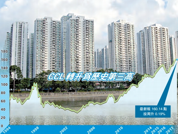 CCL(大型單位)報160.13點,連續2周創歷史新高,按周升0.03%,連升4周共1.04%。豪宅樓價升勢持續,明顯不受大市影響,指數續創新高。近11周計,CCL(大型單位)九升兩跌,當中七次創新高,11周累升2.79%。
