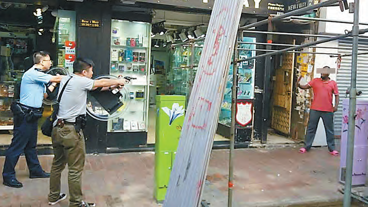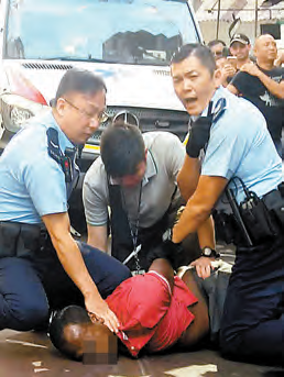 警員接報到場,持盾牌及擎槍戒備,不斷以英文勸喻黑人冷靜,對方未有理會,不斷高呼:「Idon'tneedhelp.Icometodie.Killme!Killme!」(我不需要幫忙,我來尋死的,殺我!殺我!)雙方對峙一段時間,黑人一直站在行人路上大叫,引來大批市民圍觀,警員在場疏散人潮后,上前施放胡椒噴霧,合三警之力將之按在地上制服,送院檢查后帶署助查。