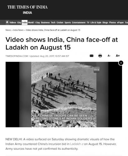 此外,从19日晚起,印媒开始大肆报道一段突然出现在网上的“印中军人拉达克冲突”的视频。《印度教徒报》20日称,视频显示中方士兵先推搡印方人员。该文援引一名视频发布者的话说:“是他们(中方士兵)先动手,我们的军人只是在反击”。《教徒报》称,该视频展现出丑陋的打群架场面,也反映了洞朗长期对峙下中印两军紧绷的神经。印度《第一邮报》20日则宣称,世界上两方士兵互扔石头的事件少之又少,此事反映出“中国对洞朗对峙有多么的失望。”