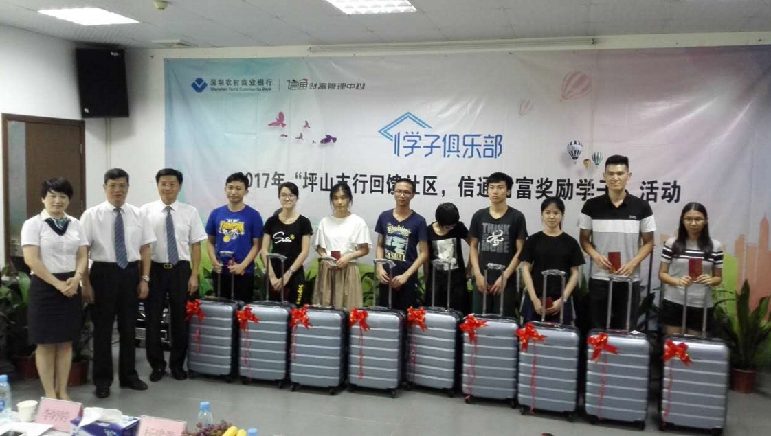 【香港商报网讯】记者焦家志、通讯员肖海强报道:8月18日,坪山区在深圳农村商业银行汤坑支行举行“深农商行回馈社区、信通财富奖励学子”活动。深圳农村商业银行相关领导、坪山辖区所有社区代表以及各社区今年新考上本科及以上高校的学子家庭参加活动,学子们现场领取了“信通英才”奖学金和箱包等学习生活用品。