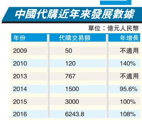 內地海外代購從2013年踏入高峰期,根據中國電子商務研究中心統計,2009年中國內地的海外代購市場交易規模僅50億元(人民幣,下同),到了2013年海外代購增速突加快,達767億元,增長58.8%。之后這股熱潮一發不可收拾,2014年交易規模突破1500億元,比2013年增加近2倍。2015年更是突破3000億元。2016年海外代購市場交易規模突破6000億元,達6243.8億元。