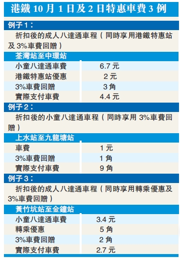 港鐵公布特別優惠詳情指,使用成人八達通乘搭港鐵本地車程的乘客可於10月1及2日享小童票價,原來享有八達通特票的乘客則只需繳付1元(機場快線、港鐵接駁巴士、往來羅湖及落馬洲的車程及東鐵線頭等費除外)。此外,乘客可同時享用現時每程八達通的3%車費回贈及其他車費優惠,包括轉乘優惠、港鐵特惠站優惠及全月通加強版連接車程75折優惠(只適用於成人八達通)。