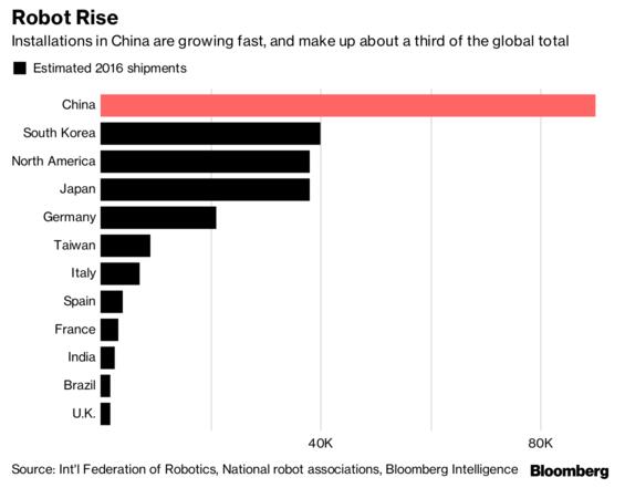 Bloomberg Intelligence的經濟學家湯姆·奧立克(Tom Orlik)和菲爾丁·陳(Fielding Chen)認為,“通過促進供給和抑制需求,自動化加劇了中國依賴于出口驅動型增長的風險,對更加平衡的國內經濟和全球經濟造成威脅。”