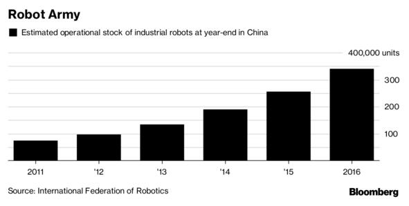 中國政府還希望在國內110億美元的機器人市場份額中增加中國品牌的份額,目標是從去年的31%增加到2020的50%以上,并在2020年每年生產10萬臺機器人,而2015年的產量為3.3萬臺。Bloomberg Intelligence認為,這意味著競爭將加劇,尤其對于目前供應中國市場67%的外國企業來說,如日本的發那科公司(Fanuc Corp.)和安川電機公司(Yaskawa Electric Corp.)。(斯眉)