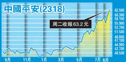 個股方面,中國平安(2318)中期盈利上升6.5%至434.27億元人民幣,派息亦增加至每股0.5元,壽險業務盈利增長36%,期內新業務價值增長46.2%至385.5億元人民幣,表現勝市場預期。產險業務盈利持平,銀行業務表現亦穩定,並加強零售銀行發展,降低業務風險。公司力發展金融科技業務,陸金所上半年財富管理交易量增長65%,並首次錄得盈利。整體業績表現理想,金融科技發展更領先同業,分拆概念有助提升估值,前景值得看好。建議於62元吸納,上望70元,跌穿58元止蝕。