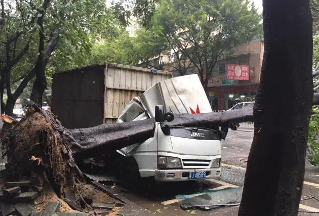 江门被台风刮倒的树木压到汽车(江轩摄)