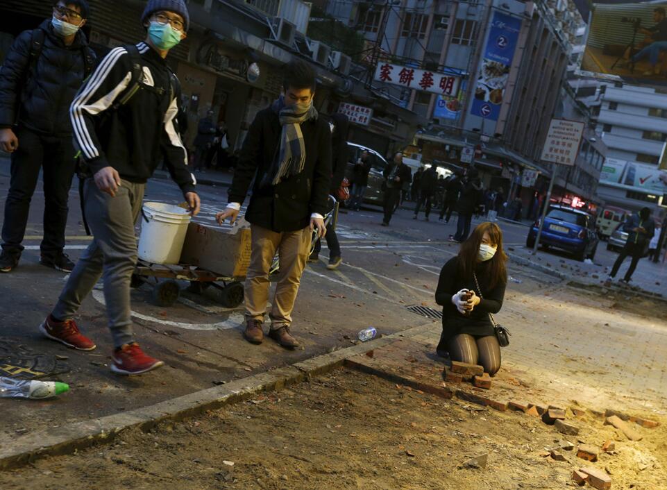 旺角暴乱期间有人在街头肆意掘地砖的镜头。