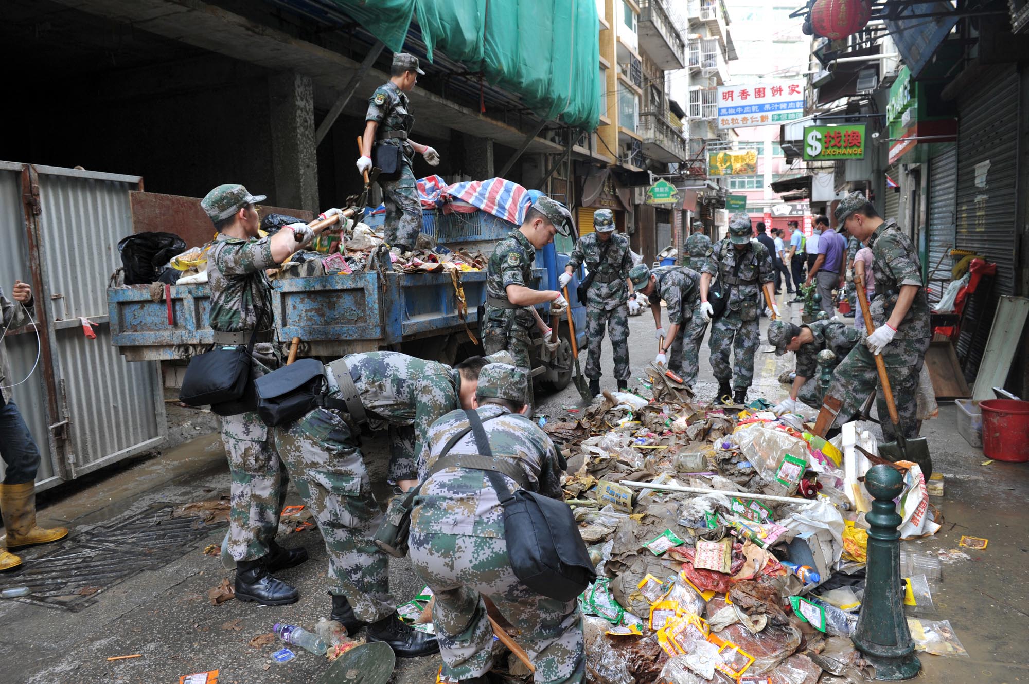 昨早9時45分,駐澳部隊約千名官兵在司令員王文少將率領下,聞令迅速奔赴受災最嚴重區域,在澳門半島十月初五街和湲仔廣東大馬路附近區域展開路障和垃圾清理。澳門警察總局局長、聯合行動指揮官馬耀權和解放軍駐澳門部隊副參謀長高志軍等到現場指揮工作。